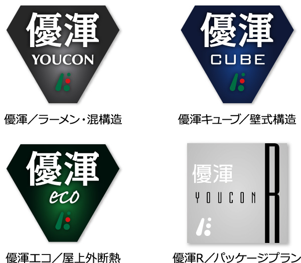 EIKOHは、お客様の様々なニーズに対応するため〈ラーメン構造〉という大きな基礎・柱・梁で構造耐力を得る「優渾」、〈壁式構造〉という壁により構造耐力を得る「優渾キューブ」、優渾・優渾キューブをベースに屋根を外断熱化した「優渾eco」、既に完成した設計・デザインをパッケージプランとしてご提供する「優渾R」をラインナップしております。