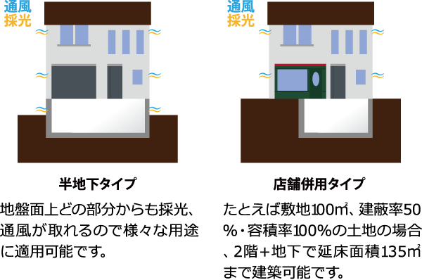 ![[半地下タイプ]地盤面上どの部分からも採光、通風が取れるので様々な用途に適用可能です。[店舗併用タイプ]たとえば敷地100㎡、建蔽率50%・容積率100%の土地の場合、2階+地下で延床面積135㎡まで建築可能です。](img/kyoukutai/p11.png)